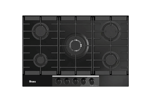 Encimera a gas natural de 5 quemadores Ursus Trotter Avantgarde GG-75T. Superficie de vidrio templado elegante y resistente, parrillas de hierro fundido y quemadores de alto rendimiento. Diseño sofisticado para una cocina moderna y eficiente.